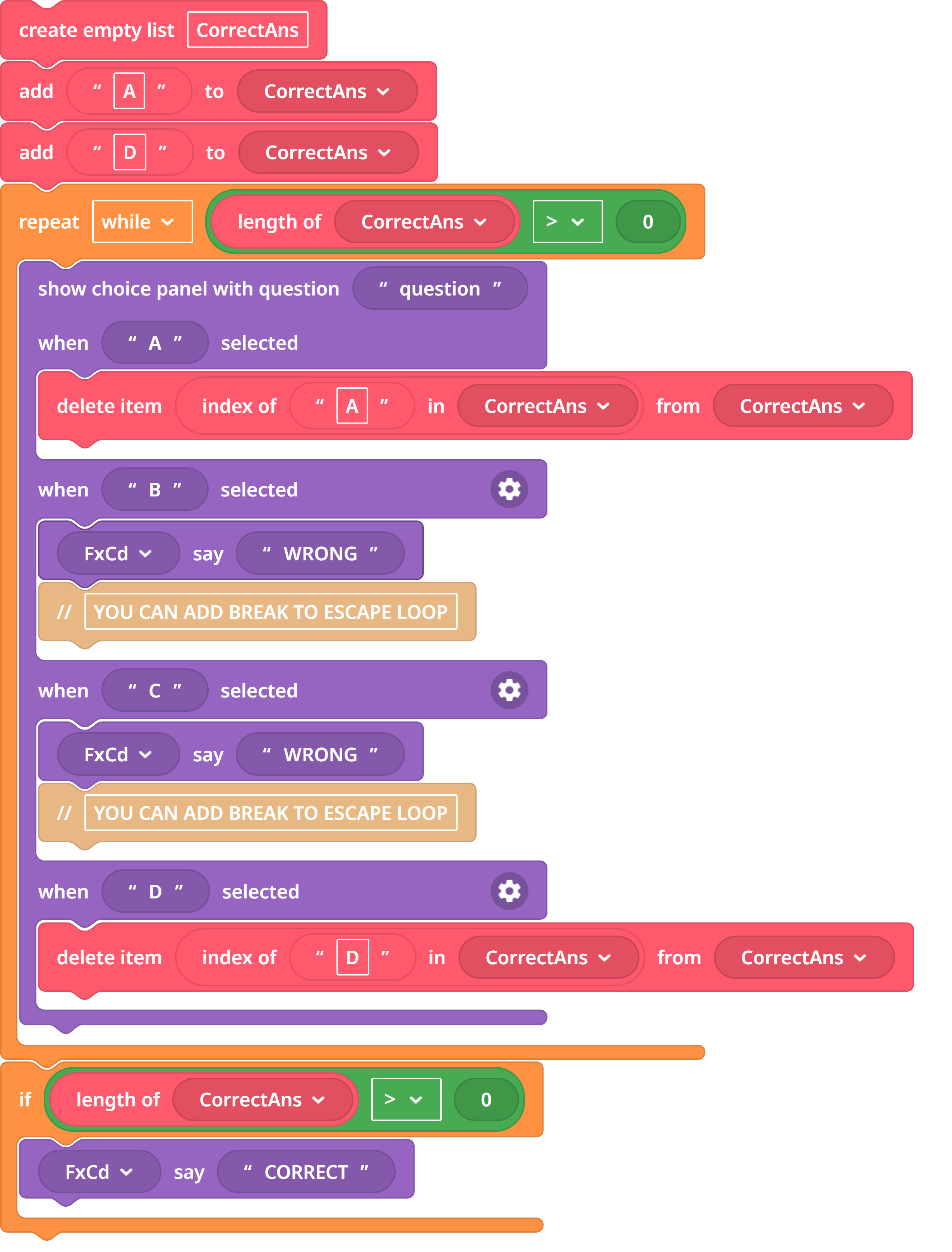 I want to implement a multiple choice question so students have to choose two right answers to get to a certain stage of the game. Is that possible? In CoBlocks I can only select one right answer.